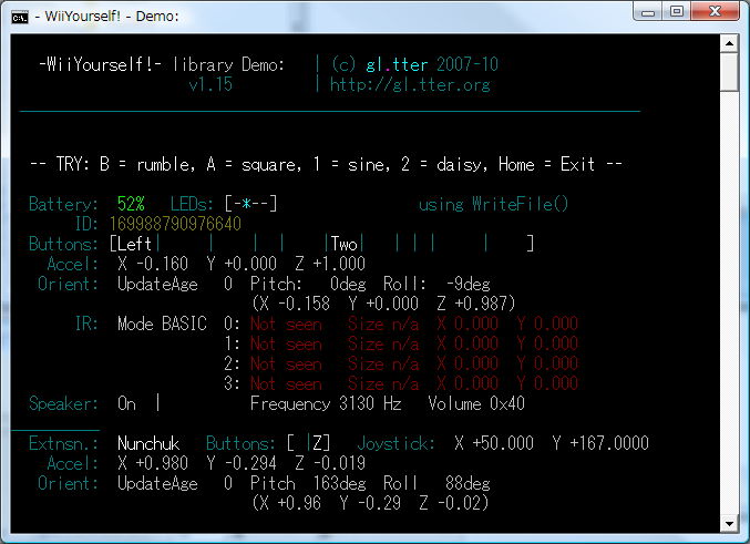 参考書の通りにBluetoothスタックを操作し、WiiRemoteを接続。で、WY!のDemo.exeを起動。おお、動いた動いた。